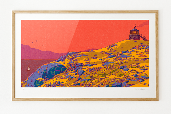 Innrammet: NB! Sendes ikke i posten – 3-5 ukers leveringstid. Trykket rammes inn med eikeramme i 2 cm bredde og 2 cm dybde hos His Galleri. Ferdig innrammet måler bildet 103x63 cm. Leveres kun lokalt (innen en radius på 2 mil) eller kan hentes hos meg. Jeg tar kontakt for nærmere avtale.